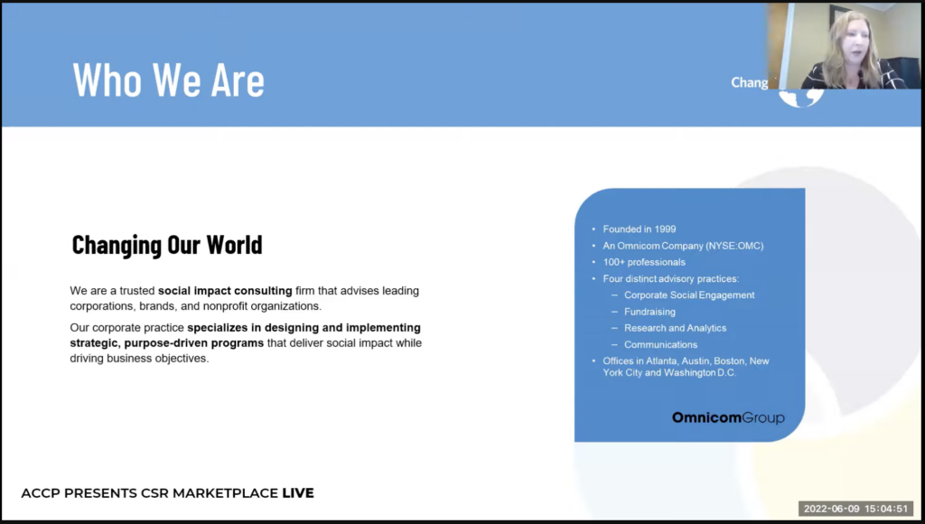 In this 2023 ACCP Marketplace Virtual session, Changing Our World’s Maureen Flynn & Leah Brody discuss the challenges corporate responsibility teams face articulating their strategy and programs effectively. During this session, Maureen and Leah walk through a step-by-step framework to structure your communications strategy, with the goal of developing more memorable and impactful storytelling. Speakers: […]