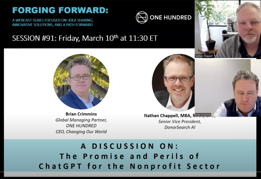 Nathan Chappel, Senior Vice President, Donor Search Ai, sits down with Brian Crimmins to provide an overview of the ChatGPT platform and how nonprofit organizations can utilize it for good. Speakers: Brian Crimmins, CEO,Changing Our World Nathan ChappelSenior Vice President,DonorSearch AI